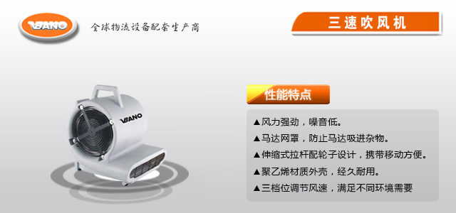 | ▲风力强劲,噪音低; ▲马达网罩,防止马达吸进杂物低; ▲伸缩式拉杆配轮子设计,携带移动方便; ▲聚乙烯材质外壳,经久耐用; ▲三档位调节风速,满足不同环境需要; |